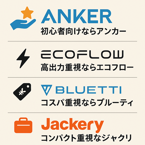 Ankerは初心者向け、EcoFlowは高性能志向、JackeryやJVCは安心感を求める人に最適です。